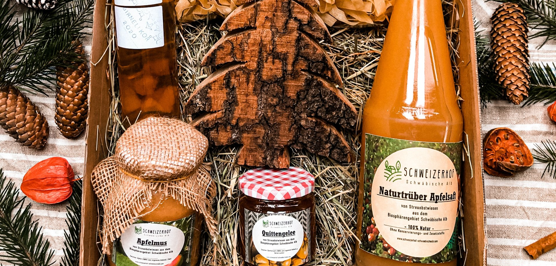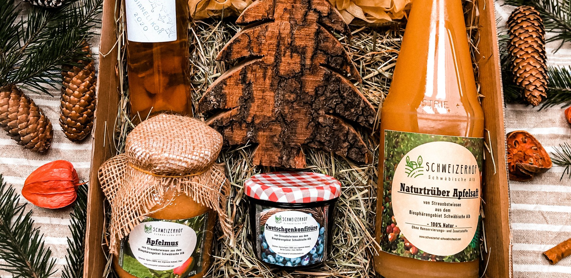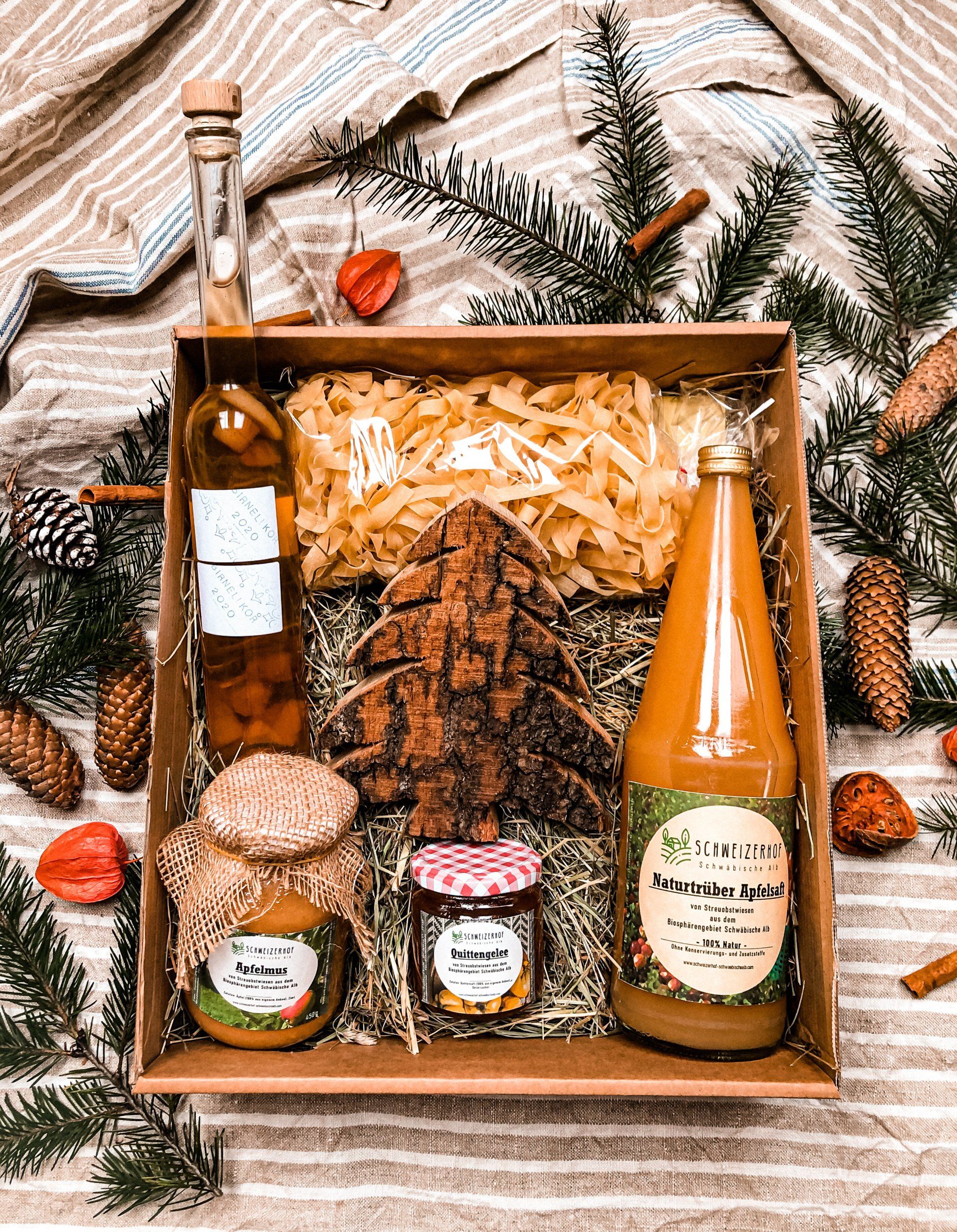 In der Weihnachts-Geschenkbox sind unterschiedliche eigene Produkte (z.B. Konfitüren, Saft, Honig, Holzdeko) sowie Produkte von regionalen Landwirten (z.B. Nudeln) zu finden.